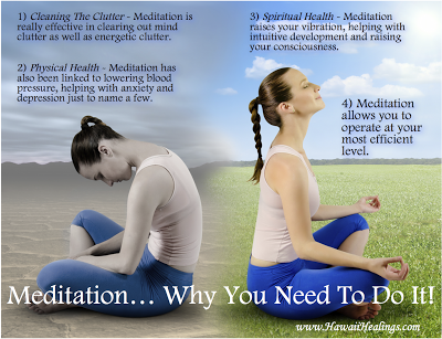 1) Cleaning The Clutter - Meditation is really effective in clearing out mind clutter as well as energetic clutter. It is equally important to maintaining your physical and spiritual health to keep your mind and your energetic field as clutter free as possible. It's like knocking out two birds with one stone, so to speak, on a spiritual and physical level.