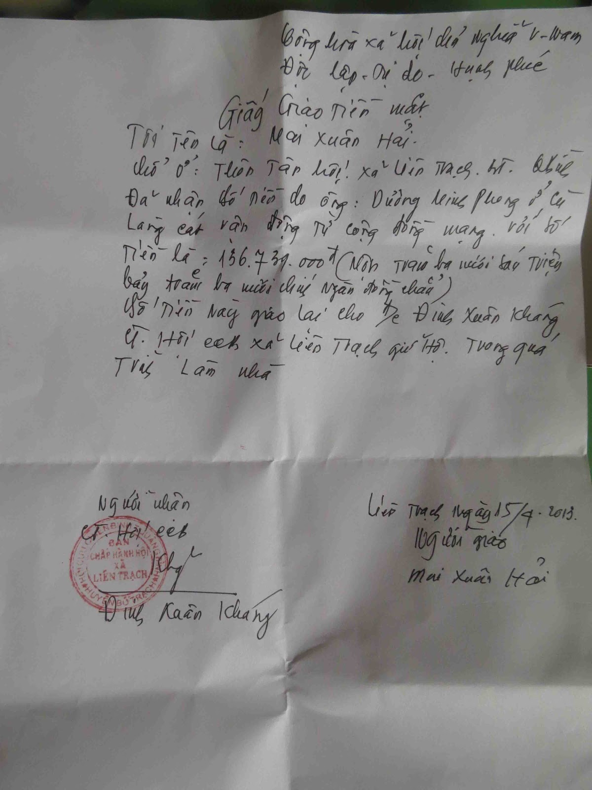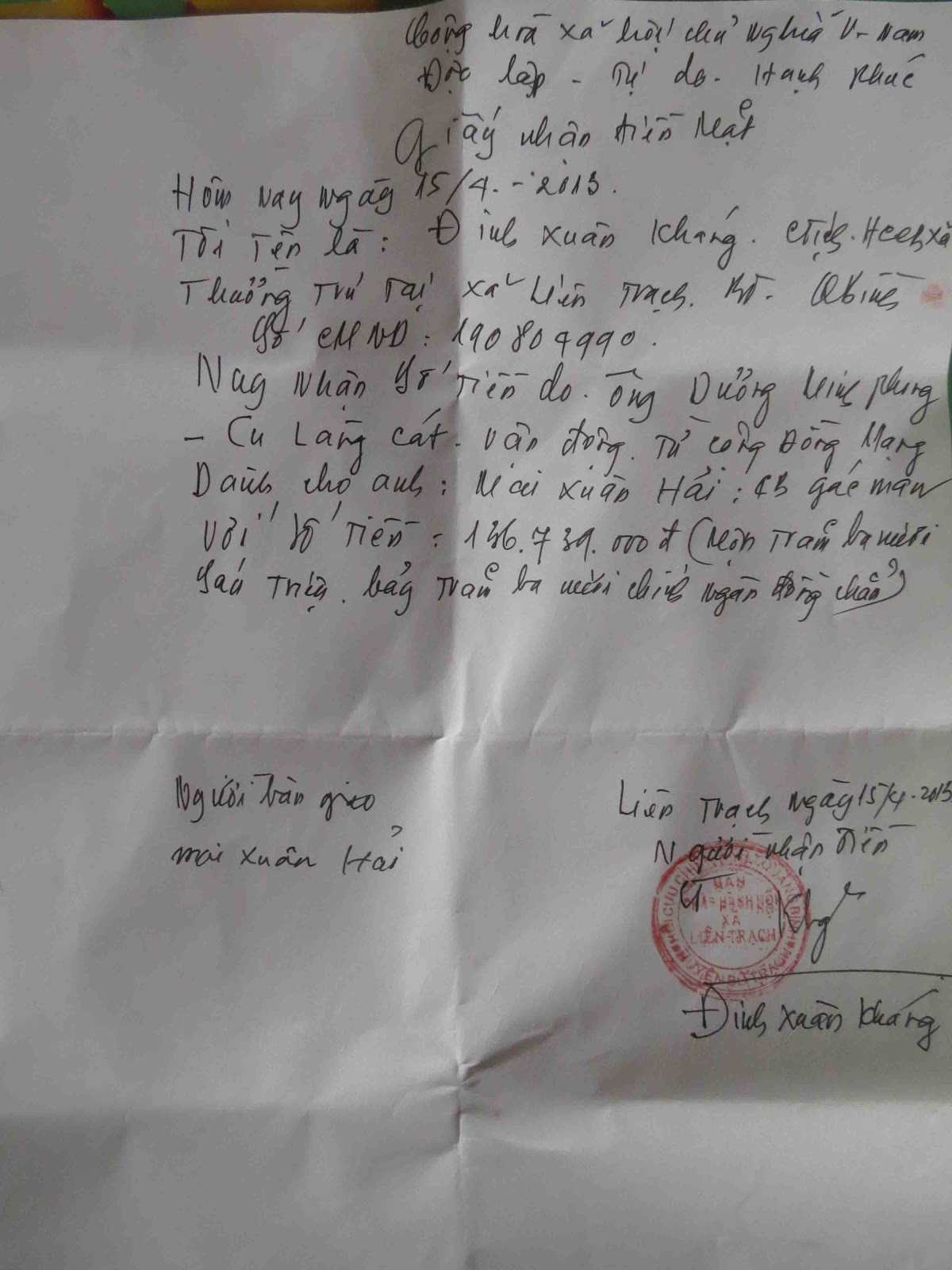 Biên nhận tiền của Chủ tịch Hôi CCB xã từ anh Hải