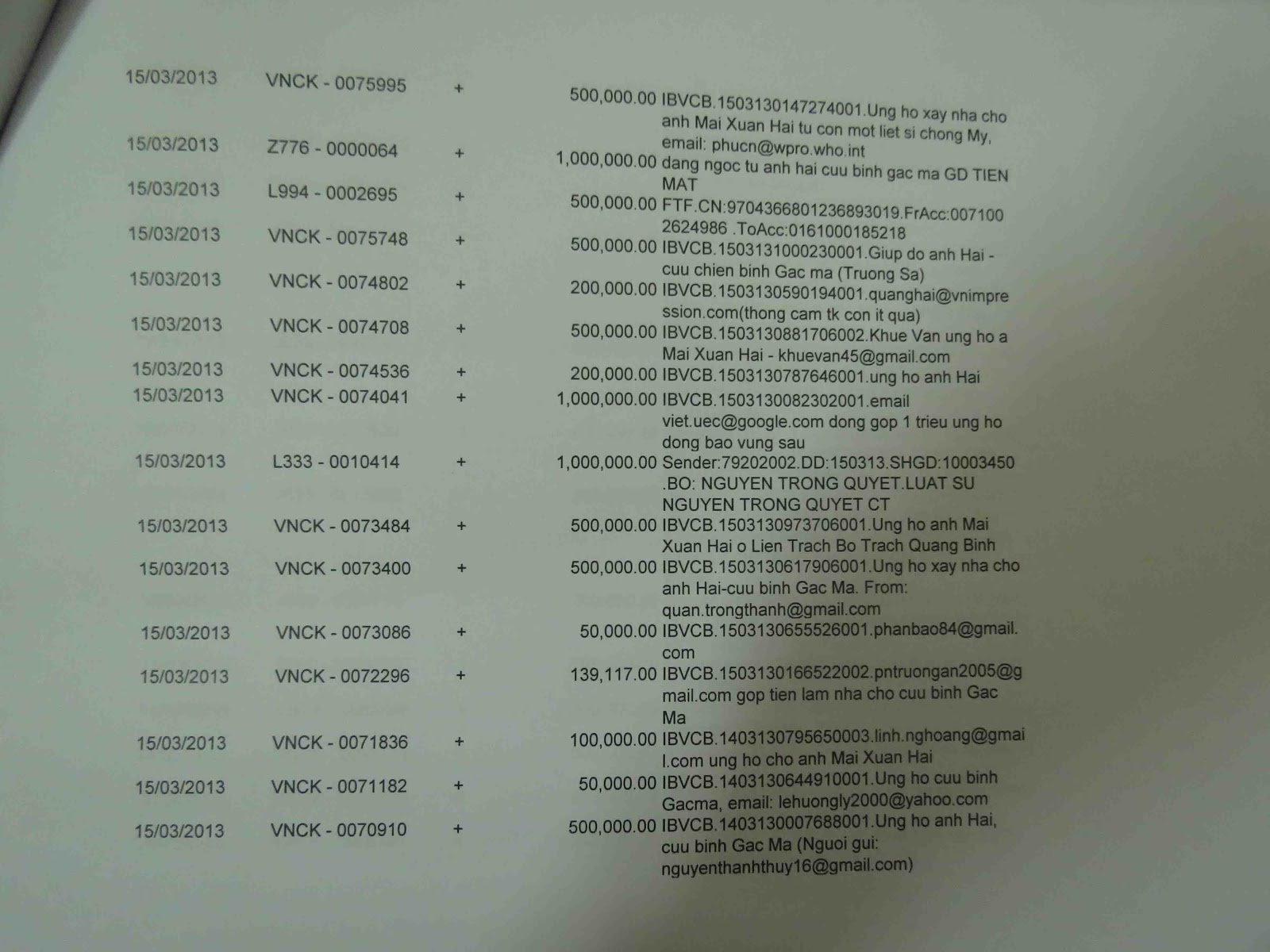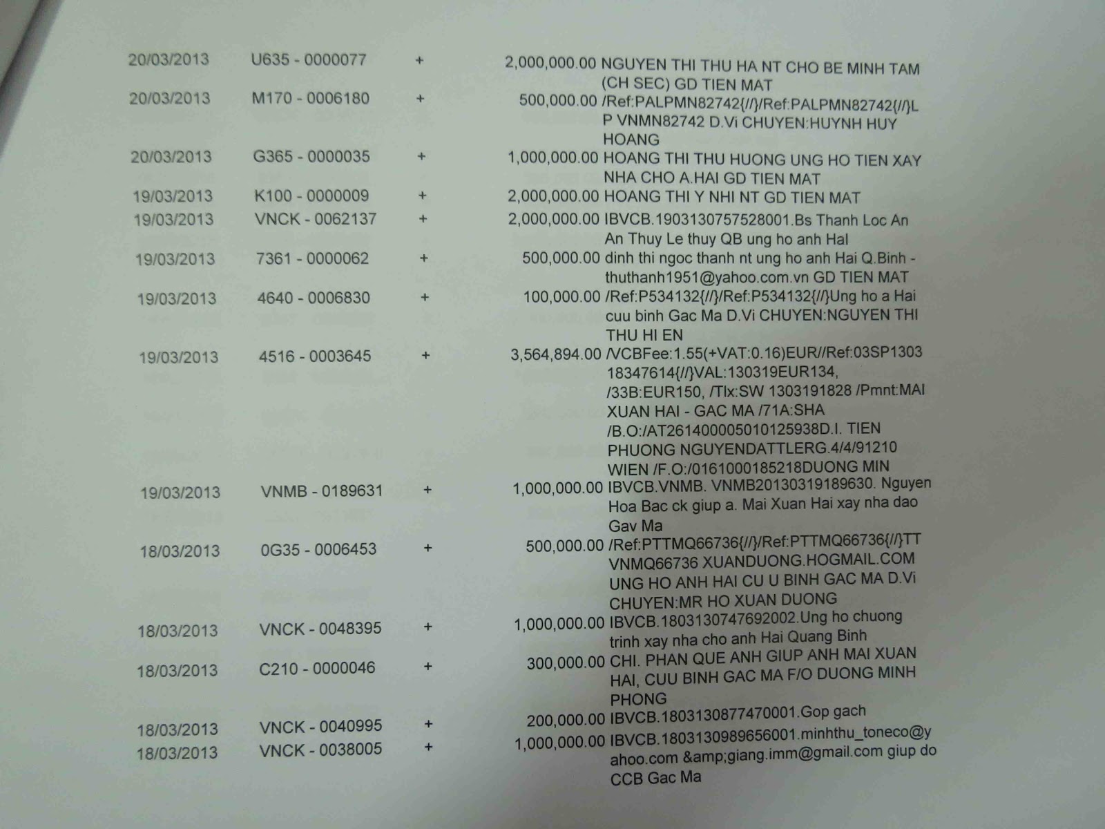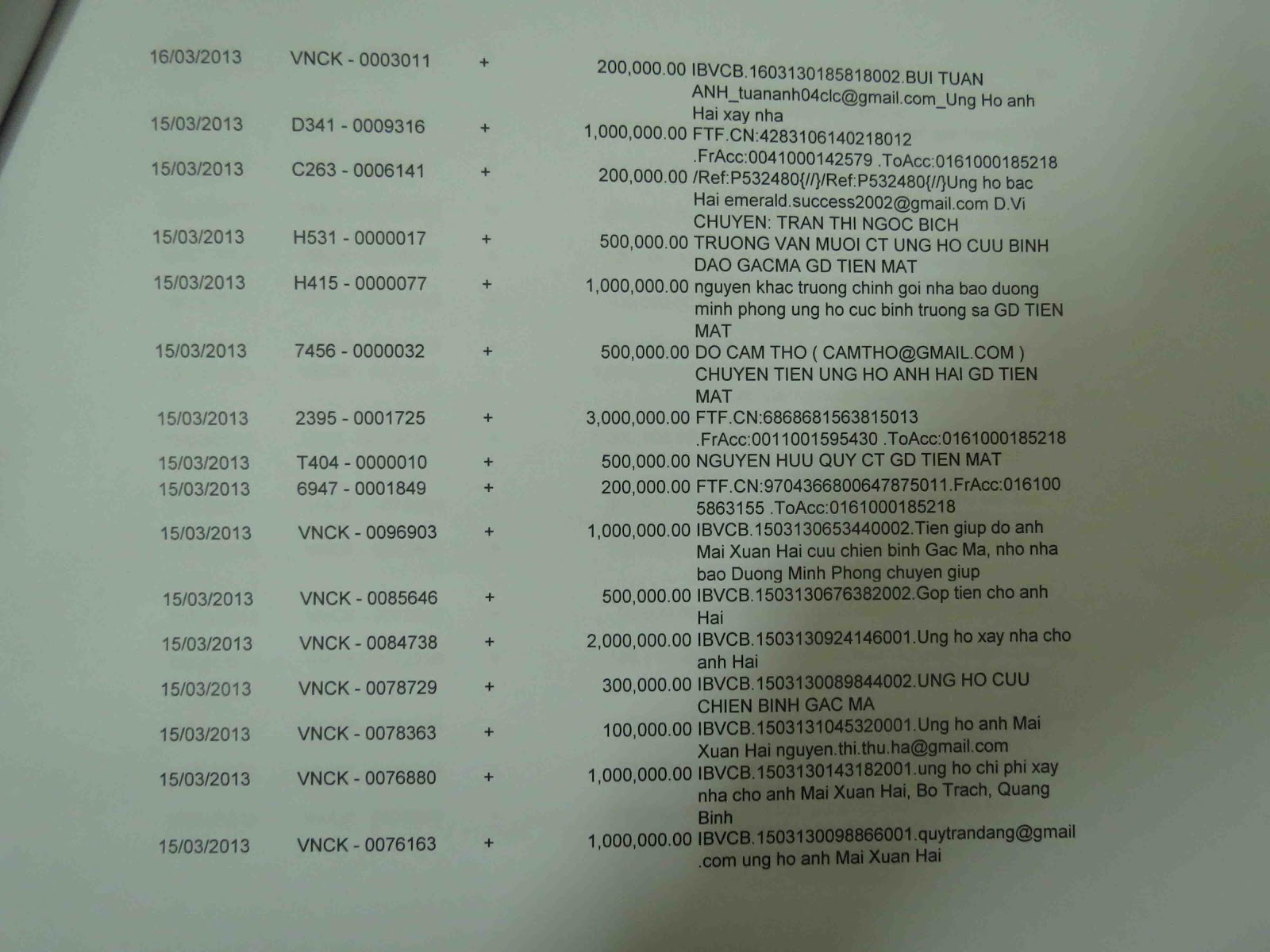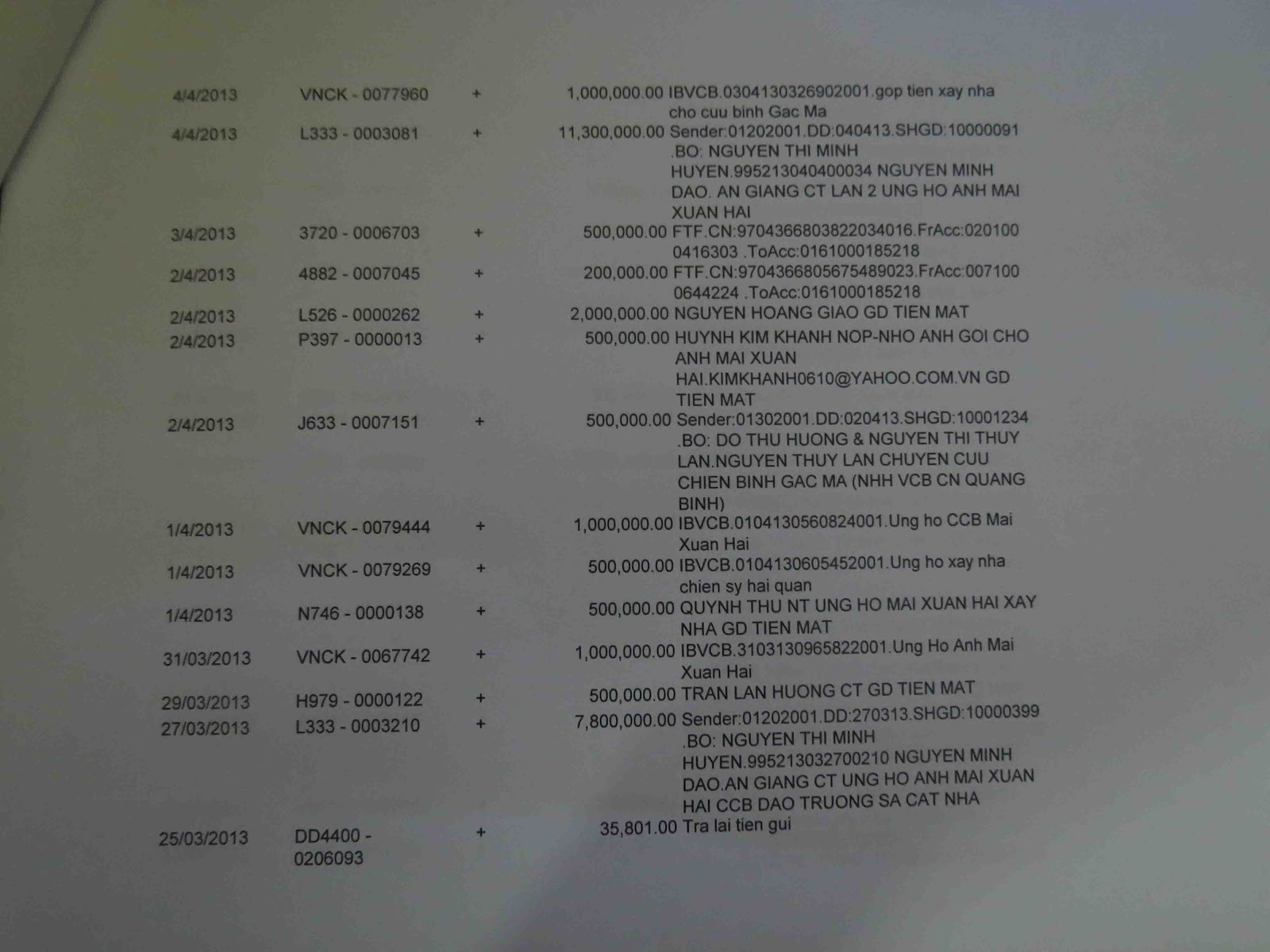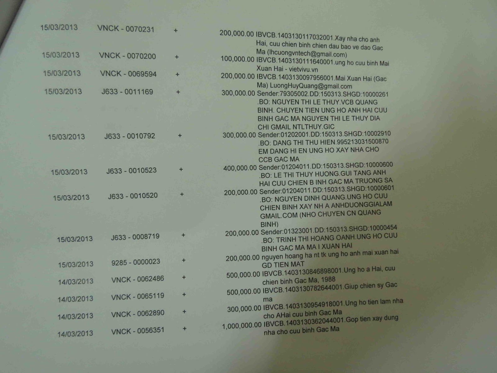 Sau đây là biên nhận và giao dịch từ ngân hàng Vietcombank: Từ ngày 12-3 bắt đầu lời kêu gọi ủng hộ góp gạch.
