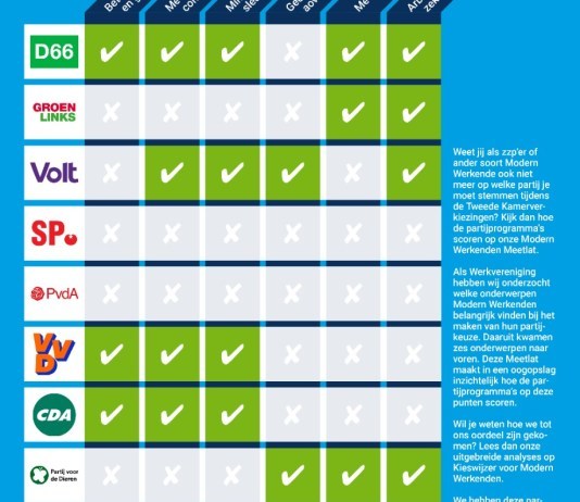 Daarom heeft de Werkvereniging de Kieswijzer voor Modern Werkenden gemaakt en doormiddel van de Modern Werkenden Meetlat in een oogopslag inzichtelijk gemaakt in hoeverre de partijprogramma’s inspelen op de 6 belangrijkste pijlers van Modern Werkenden (zie de 6 punten in de Meetlat).