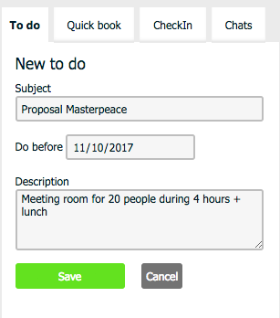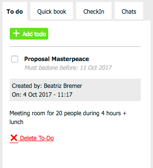 2. The other way to create a to-do is by going to reservations, invoices, proposals, customers, companies or vouchers. Whenever you click on a specific item in one of those pages, you get the option to add a note. The note can be either a reminder in that specific case, or it can be a to-do. To make it a to-do it’s also easy! just mark it as ‘Is a to-do’.