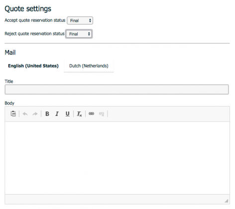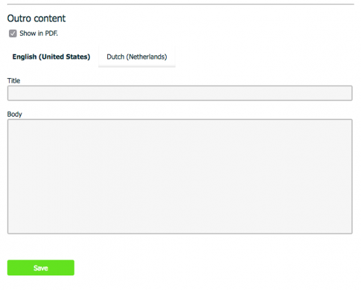 In the proposal settings, you can personalize the e-mail texts, creating versions both in Dutch and in English. The pdf that will be generated is divided into 5 different sections: Intro Content, Meeting spaces content, Options Content, Summary Content and Outro Content (the conclusion part). You can personalize all of them and choose which blocks you are going to send by checking the ‘Show in PDF’ box.