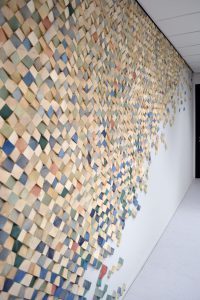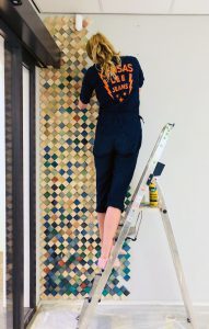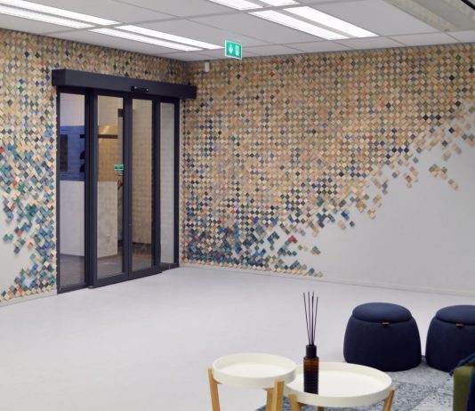 Er zit een hele studie achter het ontwerp en een heleboel manuren om het kunstwerk zo te krijgen zoals het nu is. Geef jezelf dan ook eens goed de tijd het kunstwerk te bekijken als je binnen bent bij Meeting Plaza. Als je goed kijkt zie je dat alle blokjes dezelfde maat hebben en op dezelfde manier gesneden zijn. Toch lijken ze allemaal anders door de verschillende kleuren en de verschillende richtingen waarop ze op de muur gebracht zijn. “Uiteindelijk heb ik veel tijd gestoken in hoe het er uit moest komen te zien. Daarna heb ik bijna 6000 blokjes (5972 wel te verstaan) gesneden en gekleurd en op de muur bevestigd.”