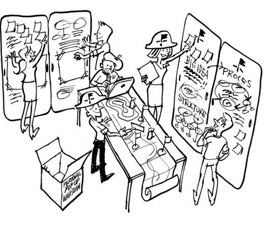 In een Rent a War Room® ruimte gebruiken we zorgvuldig uitgedacht meubilair en materialen die processen optimaal ondersteunen. Denk hierbij aan zitkubussen van stevig foam die ook als divider te stapelen zijn, custom whiteboards die te beschrijven zijn en waar dingen opgeplakt kunnen worden, grote hoeveelheden brownpaper om op te schrijven, tekenen en post-its te clusteren, onze Rent a War Room® StrategyMap waarop je alles kunt weergeven wat je maar wilt: stakeholders, beren op de weg, doelen, ambities of belangen.