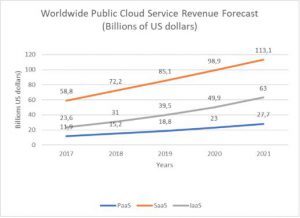Software as a Service (SaaS) and Platform as a Service (PaaS) are supposed to increase almost twice, Infrastructure as a Service (IaaS) is predicted to be nearly three times more demanded by the end of year 2021. Many famous global market players, such as Microsoft, Amazon, IBM, etc., are investing huge resources into developing cloud computing.