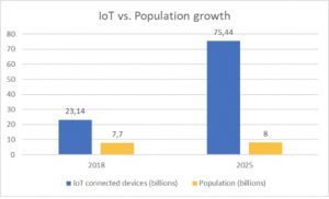 Interesting fact: by year 2018 we have roughly 7.7 billion inhabitants on the planet and 23.14 billion of connected devices (Internet of Things) according to Statista. Several theories suggest that by year 2025 world population should reach around 8 billion inhabitants and at the same time number of connected devices should reach 75.44 billion. Impressive, isn’t it? To imagine it better, you can check out the chart below: