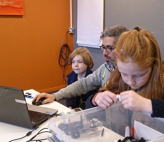 De Happy Kids basisschool heeft Khalid Ouard gevraagd het leerproces te begeleiden en zo zitten er op een woensdagochtend zes kinderen van een jaar of tien aan een tafel. Of ze staan. De kinderen leren namelijk op een actieve manier: ze lopen heen en weer van LEGO Mindstorms naar klasgenoot. In teams van twee zoeken ze informatie op de laptop, overleggen, programmeren hun robot, testen en passen hun modellen weer aan. Khalid: ‘In de eerste lessen heb ik uitgelegd wat ze met LEGO Mindstorms kunnen. Nu nemen ze steeds meer eigenaarschap en leren van elkaar. Ik ben er om ze bij te sturen.’