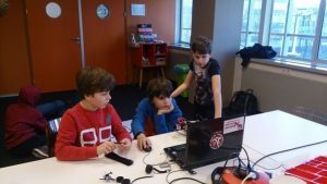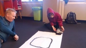 Het vehikel van Koen en Berre volgt een cirkel op een groot vel papier dat ze op de vloer hebben gelegd. ‘Als de sensor zwart ziet, gaat ie naar rechts en als ie dan wit ziet gaat ie weer terug naar links, dat hebben we zo ingesteld. Hij volgt nu eigenlijk als een pinguïn de lijn’, zegt Berre. Ze sleutelen en testen, corrigeren de programmatuur door met een USB-kabel hun robot te verbinden met de computer. ‘Dat kan ook met Bluetooth’, tipt Khalid. ‘Weten jullie hoe?’ Ze luisteren aandachtig naar hun mentor.