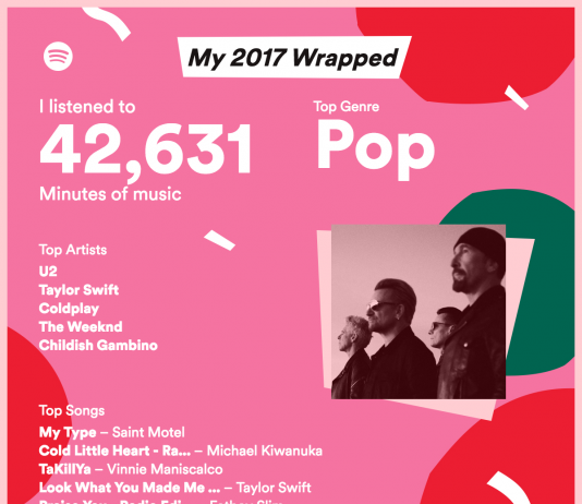 Every year Spotify releases a website where people see all their statistics. This year is no different. At 2017wrapped.com you can see how many minutes you listened to Spotify, what is the genre you listen the most, the top 5 artists and get a playlist with your 100 most listened songs. And yes. That image above shows mine! Big U2 fan here.