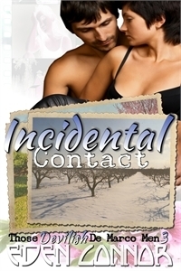 (Excerpt from Incidental Contact, Those Devilish De Marcos, Book 3-unedited and subject to deletion)Closing the door to shut out the cold, she saw Eric, already feeding wood into the stove in the den. "Mornin'." He grinned. "I see someone's cold."Her nipples had beaded from the chill in the basement. The idea he might warm them up was appealing, but the proposal stayed on her mind. She waved the bucket. "I was thinking about the migrant camp. Tell me more about it while you make your coffee." "The camp's just always been there," he answered with a shrug, closing the doors on the stove and striding into the kitchen to grab the canister of grounds. "Every summer when the caravans started driving past the farmhouse on their way up to the camp, I got excited. Everybody on a farm works. Kids included. We never got so much as a dime to help, but in the evenings I didn't want to leave camp." He flashed the grin that always made her wet and needy. "I remember the first time my grandfathers decided I was old enough to stay overnight in one of the bunkhouses. I couldn't sleep, I was so excited. There's a communal kitchen, mostly run by older women who couldn't work in the orchards. Some of the workers played musical instruments, and they'd all sing after dinner. The younger ones sometimes danced."Amy couldn't help but wonder if that attraction had been due to the fact there were mothers in the camp, women looking after their families. "Why did the peach farm shut down?" she asked, her interest piqued. Grabbing up a section of the newspaper, she began covering the counter while he filled the carafe with water and poured it into the reservoir of his small coffee maker. Eric filled the reservoir and punched the button. Amy tipped the bucket's contents onto the newsprint. Moving closer, he reached into a bucket for a pine cone, his eyes open wider now. She gave his bare chest an appreciative glance. Her nipples were warming up, but no less hard."My two grandfathers were farmers. Dad was into cars. Rafe's father outlived Nance by maybe five months. With both of 'em gone, my father inherited the land. The garage was making money and Dad was done with farming. He leased the orchards out for a while." His shoulders hitched up and down before laying the pine come on the newsprint, turning it with long fingers that made her think of the way they felt rasping her skin. "A long run of late freezes put a bunch of local peach farmers out of business. The sharecroppers lost their shirts." He frowned, turning away to pull open the door to the freezer. "What about lunch? I've got all the ingredients to make a taco casserole that's pretty good." He set a package of ground beef into the sink. "The camp fascinated me, not growing peaches." He moved to stand beside the coffee pot, glaring at the slow trickle of dark liquid.Wearing nothing but a pair of snowy boxers, the man was gorgeous. It was Sunday morning. They were alone in cabin in the woods. Amy forgot about projects and her parents. She wanted Eric now, not after he'd had three cups of coffee. "For twenty bucks, I won't tell Lila you know how to cook."His grin was lopsided when he looked over his shoulder. "Have I ever shown you how I deal with pint-sized blackmailers?" He closed the small distance between them. Her heart stuttered when his gaze raked her. His eyes seemed to turn more blue.He wrapped his hand around hers, tugging her down the short hall to his bedroom. Grabbing her around the waist, he tossed her gently onto the bed. His boxers couldn't hide his burgeoning erection, but he surprised her by turning away. Grabbing two of the wrought iron handles to pull open a drawer in a dresser made from pine and decorated with knots the color of rust, he began to toss rolled-up athletic socks over his shoulder. They landed on the tangled sheets, bouncing across the quilt made of multi-colored squares. Amy lay there, enjoying looking at his strong back and thighs. Muscles rippled beneath his dark skin. When the drawer had to be empty, he turned, still holding one pair of socks. Unrolling them, he held her gaze while he knotted them together. "Oh." Her heartbeat kicked up like a hurricane, but she smiled, thinking of his promise to identify every single thing that turned her on. She'd never been tied up to have sex before, but was game to give it a try."Oh, yes." He unrolled another pair, tying them to the first two. "Your inquisitive little mind's getting busy now, wondering what I might do to you when you're all tied up. You might even be getting a little bit wet."Since he mentioned it, she was. Excitement thrummed in her nipples, streaking toward her clit.He noticed. "You have the cutest little nipples, did you know that?"