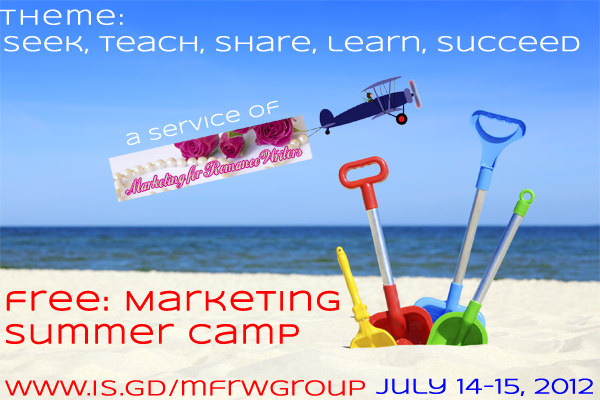 I'm a member of the Marketing for Romance Writers Yahoo Group and this weekend, July 14-15, we are hosting a marketing camp for writers!!! Just click the group link above, join the group, and you're set to enjoy some great workshops, pitch appointments with publishers, and win some awesome prizes including 50% discounted ads at The Romance Studio, gift certificates, customized book trailer, and of course, books. All attendees will receive a goody bag. Below are the workshops--taught by fellow writers--to help you get a leg up on marketing your romance book or any other novel. I hope to see everyone there!