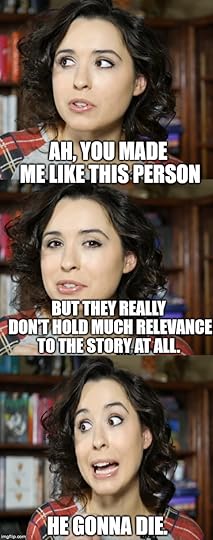 Except that we’re not told what kind of key it is or how big it is, so we’re imagining an old-fashioned “key to the city” deal. So when Teiran pours all her water out of her flask into the vase to make the vase float to the top, I’m just like “Ignoring the fact that that’s impossible, way to be original and steal right from Aesop in a book that’s already a ripoff of Goblet of Fire, Hunger Games, and the Enchanted Forest Chronicles!” Meanwhile, it would have been way more interesting if the author had done something more original. Like if the naiad created individualized trials for everyone, psychically reading into each competitor’s individual strengths and weaknesses. In fact, I might not have hated this book so much, because then we would have been able to see more character development from Teiran. This is normally where I would suggest something the author should have done to exploit Teiran’s weaknesses, but Teiran was a f*cking Mary Sue and had none.