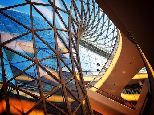 I take off my jacket as it's getting slightly warmer. Or, maybe my body has warmed up from all the walking. Before heading for the tower, I check out the mall next to the one I'm at, and I'm glad for the decision. Part of the glass roof is a funnel that arches up and widens toward one end.