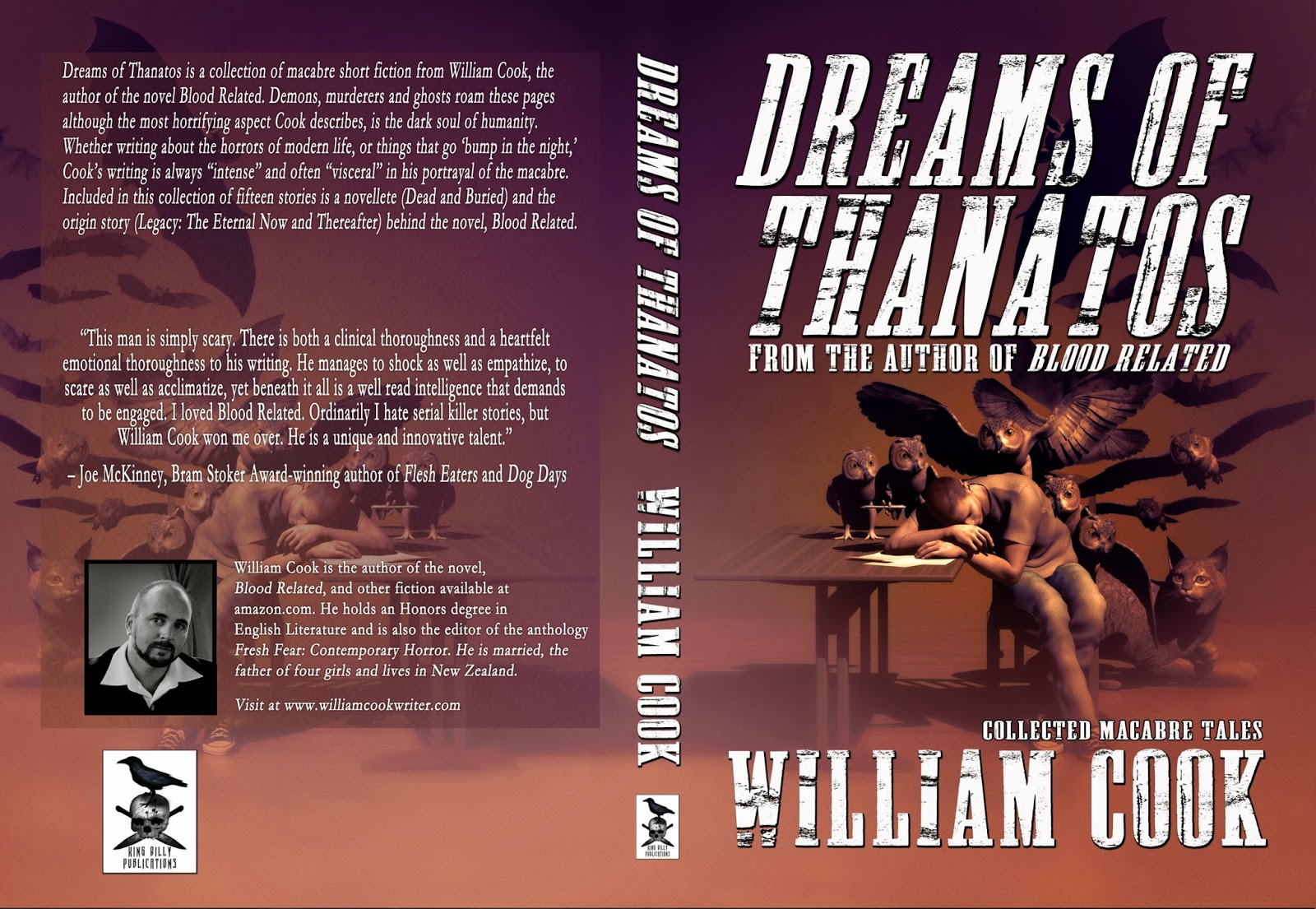 Dreams of Thanatos is a collection of macabre short fiction from William Cook, the author of the novel Blood Related. Demons, murderers and ghosts roam these pages although the most horrifying aspect Cook describes, is the dark soul of humanity. Whether writing about the horrors of modern life, or things that go ‘bump in the night,’ Cook’s writing is always “intense” and often “visceral” in his portrayal of the macabre. Included in this collection of fifteen stories is a novelette (Dead and Buried) and the origin story (Legacy: The Eternal Now and Thereafter) behind the novel, Blood Related.