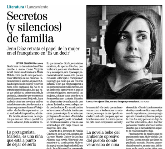 Con Jenn Díaz no caímos en la tentación de hablar sobre generaciones literarias, pero iniciamos nuestro encuentro haciendo referencia a una de las cuestiones (¿inevitables?) que siempre surgen cuando se la cita: la edad. El caso es que con Es un decir -Editorial Lumen-, su cuarta novela publicada, reincide en el ruralismo, ambientado en la época de posguerra, y con una protagonista infantil repleta de dudas al fallecer su padre en extrañas circunstancias, y que va resolviendo a medida que nos adentramos en las historias de la familia.