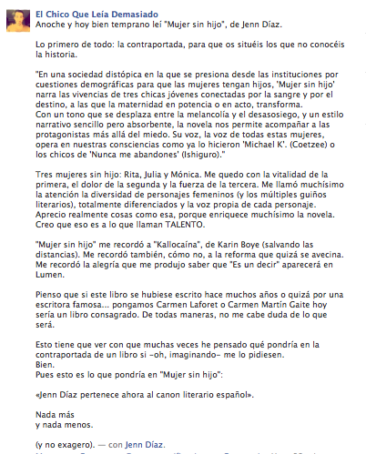 Anoche y hoy bien temprano leí "Mujer sin hijo", de Jenn Díaz.