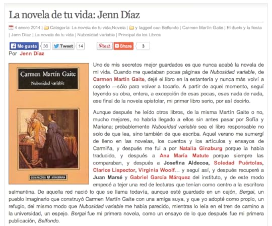 Uno de mis secretos mejor guardados es que nunca acabé la novela de mi vida. Cuando me quedaban pocas páginas de Nubosidad variable, de Carmen Martín Gaite, dejé el libro en la estantería y nunca más volví a cogerlo —sólo para volver a tocarlo. A partir de aquel momento, seguí leyendo su obra, entera, a excepción de esas pocas, esas nada de nada, ese final de la novela epistolar, mi primer libro serio, por así decirlo.