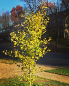This morning–finally!–the young ginkgo tree decided to start letting its leaves change to that signature gold. We were worried. We wondered if our tree would ever turn colors. I even researched the problem. What could we do? Every other tree in the neighborhood boasted beautiful autumn leaves weeks ago. The other, older ginkgo trees had long ago blessed the neighborhood with golden leaves. They then dropped their leaves in acrobatic displays. They then stretched bare limbs to the sky.