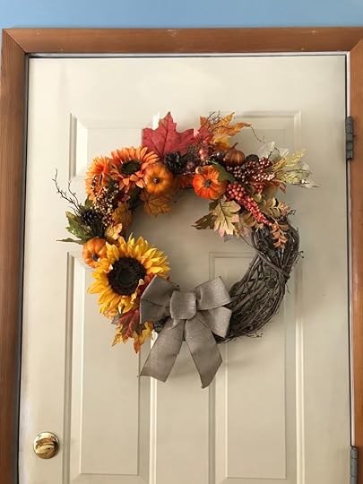 I went to the craft store, and I found a grapevine wreath base, this bow, and some sprigs of little pumpkins and autumn leaves. I found a few sunflowers, too. I used crafting wire to tie everything to the wreath base. I’m so happy with how it turned out! I never knew I had it in me, but with the help of my daughter, I made something worth hanging up!