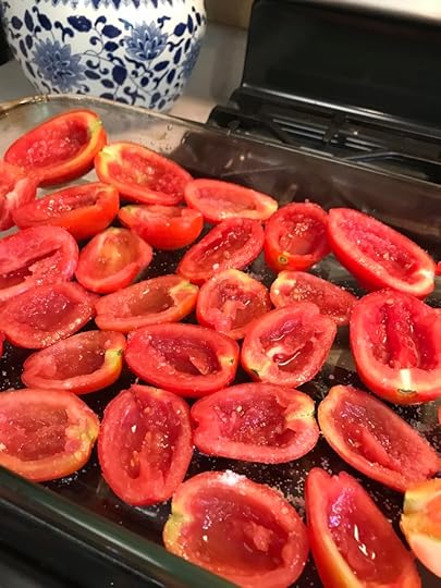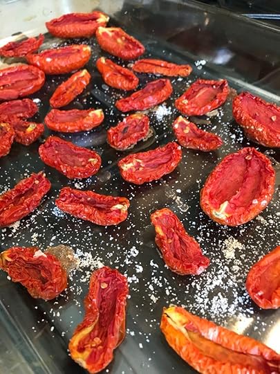 I also love making oven-dried tomatoes with all my Roma tomatoes. Once you’ve collected enough from your garden (or, if you’re like me, your neighbors offer gifts of surplus tomatoes), simply slice, remove the seeds, and add salt. Place on a baking sheet at 250 degrees for several hours. Check each hour to see how dried they are. Then, you can store them in the fridge, freeze them, or eat them right away with a little olive oil and fresh basil. All winter, I’ll use use the stored dried tomatoes in sauces, in sandwiches (see above!), and on our pizzas.