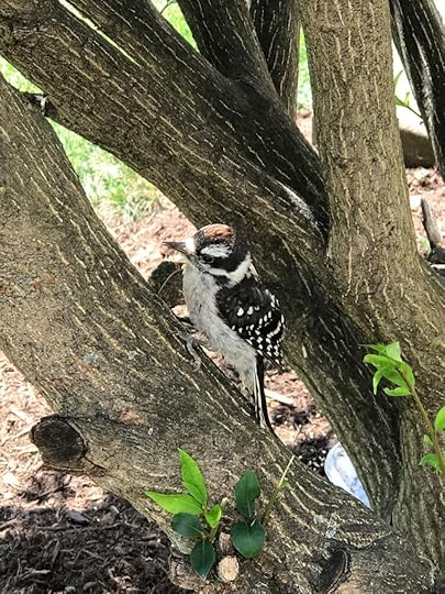 It seems it’s my year for finding marvelous things in nature. The baby woodpecker has returned mornings and evenings to visit us from his perch in the winterberry bush. The garden cat, of course, now won’t make his rounds during those times. I’ll keep him inside so he doesn’t terrorize this bird.