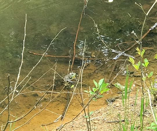 We follow the sound of the symphony and come upon this: We see logs filled with frogs as they sun themselves. We see shiny green heads and bright eyes emerging from the mud. We see them on the banks and in the water. We stand for a few minutes and watch and listen in wonder at the conversation of frogs.