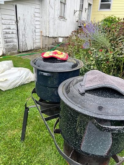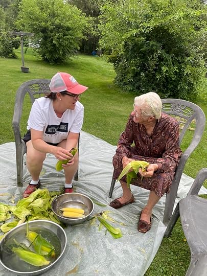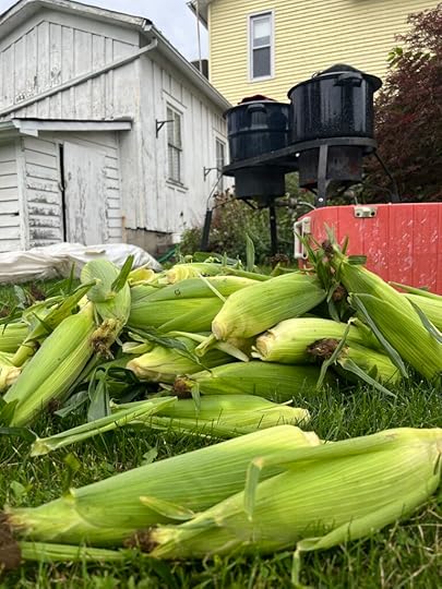 I observe three enormous sacks of freshly picked corn from the field. I took my place in history beside the 90 year-old great grandmother who showed me what to do. Her eyesight was better than mine. She told me stories of growing up in the country. I learned about butchering day. I listened to her recite a hymn. We sat together for 3 hours, shucking and silking corn. Her granddaughter came drove from Harrisburg with her children just for this day and she worked to rinse the corn. Nobody misses this day.