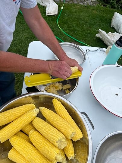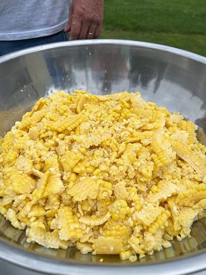 I shucked. I silked. I cooled my hands in hose water from the heat of boiled corn. The family taught us to boil the ear of corn before we shuck it. Then, we used a fun device that cuts all the kernels off the corn. I was terrible at it. Inside, we filled freezer bags with the fresh corn that would be vacuum-sealed for the winter. Ashley and I would take 20 bags.