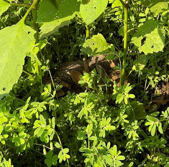I glance down into the weeds. There, I see three bunnies, no bigger than my palm, nestling together. Fresh from the nest, they enjoy the cool shade of weeds and a perfect hiding place from predators. In fact, I wonder if Mother Robin right above them will sound an alert if anything dares approach. I turn to my left to see Mother Rabbit enjoying her breakfast of grasses near the back fence. The weeds are a blessing.