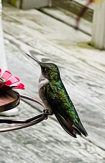 I decide to check the water level in the birdbath since we’ve had some hotter days. Plus, these robins splash and bathe like it’s their own personal pool party every hour.
