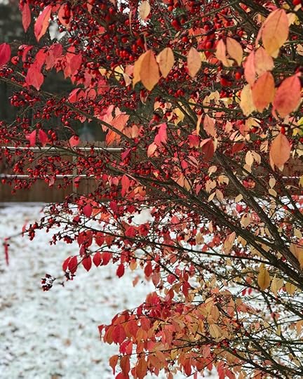 We wake to an unexpected first snow that makes the Winterberry bush stand out, red and eager, against the landscape. Soon, the Northern Cardinals will return to backyard from wherever they’ve traveled. My husband will place fresh seed in the feeders for all our winter backyard birds.