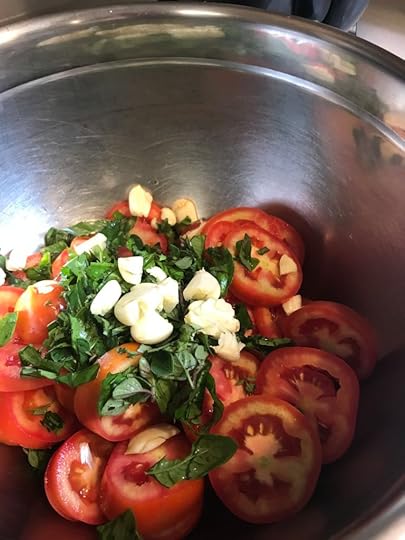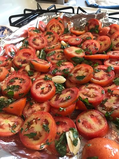 I slice the tomatoes, mix them with garlic, a drizzle of olive oil, and all the chopped herbs still in the garden (oregano, thyme, and basil). I spread them in a pan and sprinkle them with salt and pepper.