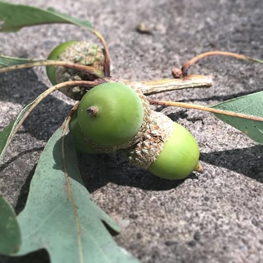 On the sidewalk this afternoon on the way to the mailbox, I find a cluster of fallen green acorns. What a happy find to know that autumn will come!