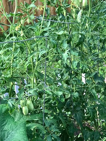 Meanwhile, on the other side of the garden, something succeeds with little tending. My tomatoes glisten in the morning sun as they grow protected in their cage within the little chicken wire reinforced fence.