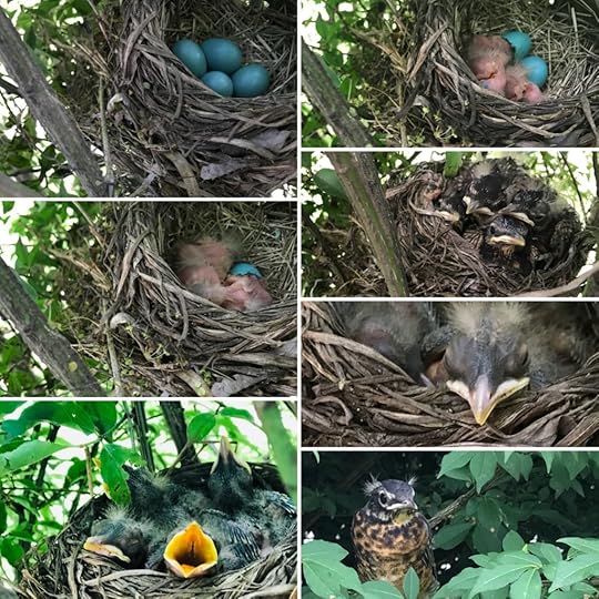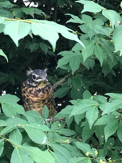 I continue to learn so much from my baby robins. I thought they would fledge on Wednesday, but I think I miscalculated. They still stay tucked in the nest, warm and well-fed. I glance at the nest every hour to see if the robins have hopped to the ground.