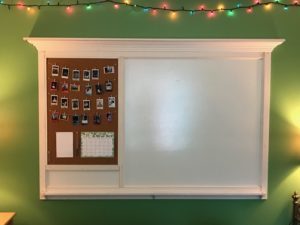 For one of the updated bedroom ideas put forth by my oldest daughter, Ash used whiteboard paint to create an enormous whiteboard that combines with a cork board for notes and photos. He framed the borders and made a ledge for all her dry erase markers. She claims she needs the whiteboard for all her complex math problems! (I, of course, picture Sheldon Cooper from the Big Bang Theory, working on all his equations).