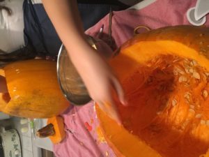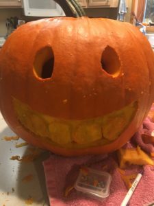 My daughter stays in process with her pumpkin that will wear braces on the teeth she’s carving.
