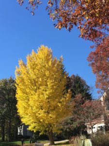 My favorite neighborhood tree takes its time to turn golden. And then one day, when the blue sky and burgundy neighboring trees arrive to enhance its color, it decides it’s ready.