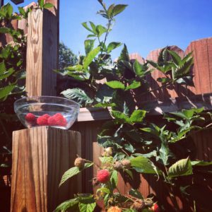 Since the pumpkin patch overtakes the raspberry canes, I resign myself to a diminished harvest. Even now, with the blue sky, the bright red berries, and my little bowl balanced on the beam that helps stabilize my blackberries, I find myself filled with joy.