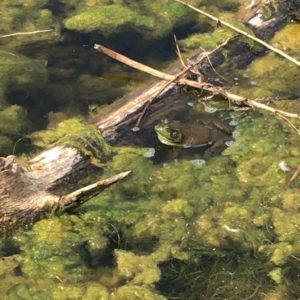 I see them in the murky water. Their glossy green heads, still as mossy stones, watch us. One jumps up towards a nearby log, and the sheer size of him astonishes us. Bullfrogs.