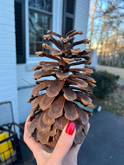 I find myself on a walk in North Carolina alongside the Longleaf Pine. These trees don’t grow in Pennsylvania; this explains why I’m marveling over their enormous pinecones. These pinecones grow up to a foot in length. I gather a few that fell onto the sidewalk. Later, I discover that my great aunt collected many of these beautiful pinecones and stored them in her basement. She offered two bags of stored pinecones for me to use as winter decoration. I learn that it’s possible to grow a pine tree (with much patience) from ancient pinecone seeds if they were stored properly. I notice several winged seeds that I might try to propagate. I’ll keep you posted!