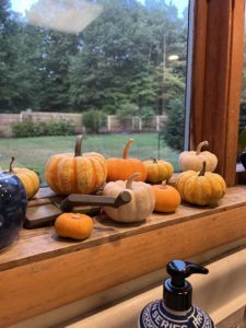 When my daughter decided to plant tiny seeds to create a garden full of miniature pumpkins, I couldn’t predict how much I’d enjoy the lovely harvest. We gave little pumpkins away to the neighbors, scattered them around our front porch, and lined the windowsills with them. I love the simplicity of fall decorations in the kitchen. I also love that the seeds cost less than a dollar. We’re definitely planting these again next year. As I wash dishes, I think of simple pleasures like little pumpkins in the window.