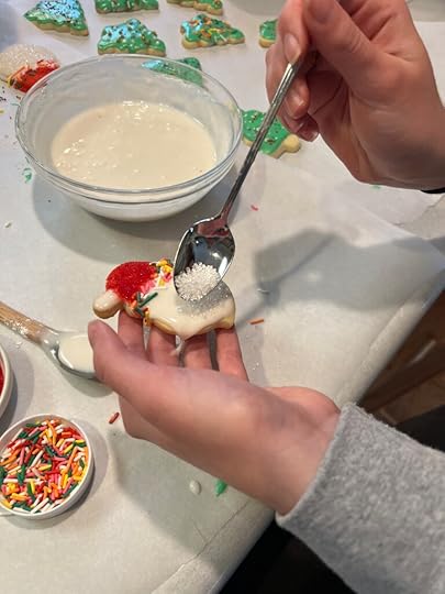 For two decades now, I’ve made Christmas cookies to pass around to friends, family, and colleagues. We officially started the “Cookie Factory” yesterday. My daughter and her college roommate came home to help, and we even enjoyed the creative assistance of the little girls from next door. We keep a pile of Christmas cookies in the kitchen from December 1st onward, but mostly, we wrap stacks of them in cellophane and gold ribbons to distribute. I use this sugar cookie recipe and then an almond icing with powdered sugar. I make a fresh batch every week or so until Christmas. The Cookie Factory represents a joyful celebration that’s become something I love; I spend leisurely time in the kitchen.