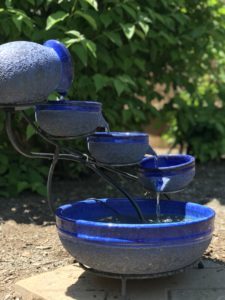 Each morning, I eagerly await the sun. When the sun shines in the morning–and the fountain begins its work–the birds come and fill each bowl with happy splashes as they bathe. It’s adorable and joyful. They dip their heads and wings into the water’s flow, and I love to watch it all. Fluffy robins actually sit in those little bowls as if they’ve made them their own personal hot tubs.