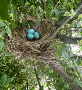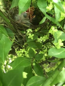 In the winterberry bush, a robin built her nest right next to the sparrow nest. I suppose our attempts to woo birds to the backyard worked indeed! We provided nesting materials (twigs, hair, twine, grasses), a bird bath, and plenty of birdseed. We also have a fence that keeps out most wildlife. Perhaps best of all? Our garden cat Louie—while terrorizing these poor birds–also keeps the chipmunks, squirrels, and other predators away who might disturb the nests and even eat the eggs.