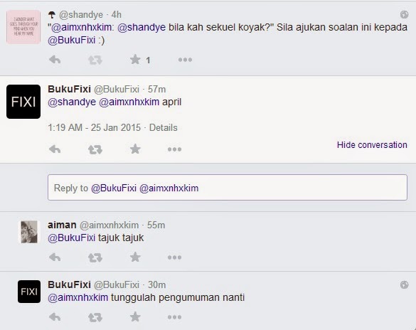 In fact, FYI... saya dah hantar dua, ya... DUA manuskrip ke Fixi, dan salah satu daripadanya adalah sambungan kepada KOYAK. Jadi jangan nak main tuduh yang tahun ini saya tak produktif dan hanya lepak-lepak chill main dengan kucing je (*menjeling beberapa orang tertentu yang selalu carut saya dalam group WhatsApp*), dan sekarang ni tengah giat menulis manuskrip baru yang sadly tak sempat saya siapkan untuk NaNoWriMo.