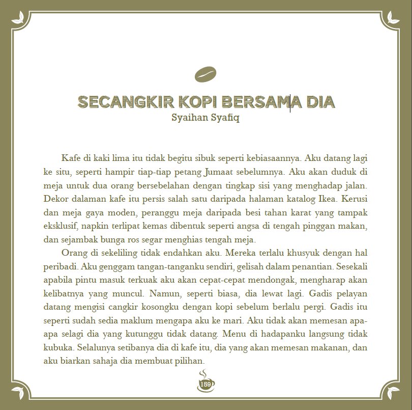Cerpen yang aku kira entah apa-apa yang sudah aku peram agak lama (setahun lebih, mungkin?) setelah ia gagal untuk disenaraipendekkan dalam antologi Orang Macam Kita akhirnya bakal menemui para penggemar kopi dan penagih cerita-cerita pendek dalam...