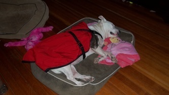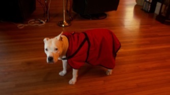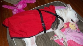 Flash forward to this week. I pulled out a sweater box under the guest bed and discovered Pepper's old coat. Our pit bull, Moxie, is now somewhere between 11-14 years old and has arthritis. Seemed to me that wearing Pepper's coat would not only keep Moxie warm indoors, but would keep her joints warm.