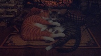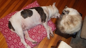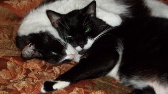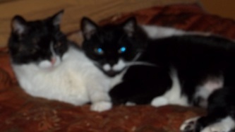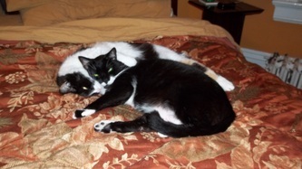 Pictured above are my two love birds, er, love cats, Zoe and Spencer. Zoe came from the animal shelter and Spencer was born to a stray cat in my neighbor's yard. They luv each other...can you tell?