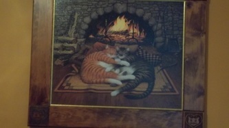Now, what would a cute cat story be without a Casa Sullivan oddity? Check out the photo gallery below. Before we acquired the Charles Wysocki painting of the orange and gray tabby sleeping together, none of our cats cuddled. Once we hung it over our bed--BOOM!--we had 3 pairs of cuddling cats: Cosmo & Cleo, Zoe & Spencer, and Buddy & Ernie. I had to stop buying cat art because it seemed like as soon as I bought a piece, a corresponding cat would show up wanting a home.